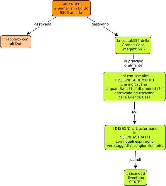Questa Cmap, creata con IHMC CmapTools, contiene informazioni relative a: Invenzione della scrittura, la contabilità della Grande Casa (magazzino ) in principio oralmente poi con semplici DISEGNI SCHEMATICI che indicavano la quantità e i tipi di prodotti che entravano ed uscivano dalla Grande Casa, SACERDOTI a Sumer e in Egitto 5500 anni fa gestivano la contabilità della Grande Casa (magazzino ), SACERDOTI a Sumer e in Egitto 5500 anni fa gestivano il rapporto con gli Dei, poi con semplici DISEGNI SCHEMATICI che indicavano la quantità e i tipi di prodotti che entravano ed uscivano dalla Grande Casa poi i DISEGNI si trasformano in SEGNI ASTRATTI con i quali esprimono verbi,aggettivi,congiunzioni,etc., i DISEGNI si trasformano in SEGNI ASTRATTI con i quali esprimono verbi,aggettivi,congiunzioni,etc. quindi I sacerdoti diventano SCRIBI
