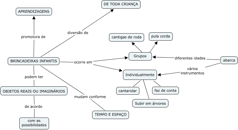 Esse mapa conceitual, produzido no IHMC CmapTools, tem a informação relacionada a: novo mapa, Subir em árvores ???? Individualmente, Individualmente ???? faz de conta, Grupos ???? pula corda, BRINCADEIRAS INFANTIS ocorre em Grupos, BRINCADEIRAS INFANTIS promotora de APRENDIZAGENS, OBJETOS REAIS OU IMAGINÁRIOS de acordo com as possibilidades, abarca vários instrumentos ????, BRINCADEIRAS INFANTIS ocorre em Individualmente, BRINCADEIRAS INFANTIS podem ter OBJETOS REAIS OU IMAGINÁRIOS, BRINCADEIRAS INFANTIS mudam conforme TEMPO E ESPAÇO, BRINCADEIRAS INFANTIS diversão de DE TODA CRIANÇA, abarca diferentes idades ????, Individualmente ???? cantarolar, Grupos ???? cantigas de roda