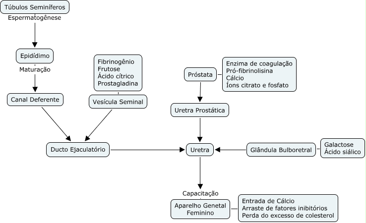 Esse mapa conceitual, produzido no IHMC CmapTools, tem a informação relacionada a: Espermatogênse, Galactose Ácido siálico Glândula Bulboretral, Epidídimo Maturação Canal Deferente, Vesícula Seminal Ducto Ejaculatório, Túbulos Seminíferos Espermatogênese Epidídimo, Canal Deferente Ducto Ejaculatório, Uretra Capacitação Aparelho Genetal Feminino, Próstata Uretra Prostática, Uretra Prostática Uretra, Fibrinogênio Frutose Ácido cítrico Prostagladina Vesícula Seminal, Glândula Bulboretral Uretra, Enzima de coagulação Pró-fibrinolisina Cálcio Íons citrato e fosfato Próstata, Entrada de Cálcio Arraste de fatores inibitórios Perda do excesso de colesterol Aparelho Genetal Feminino, Ducto Ejaculatório Uretra