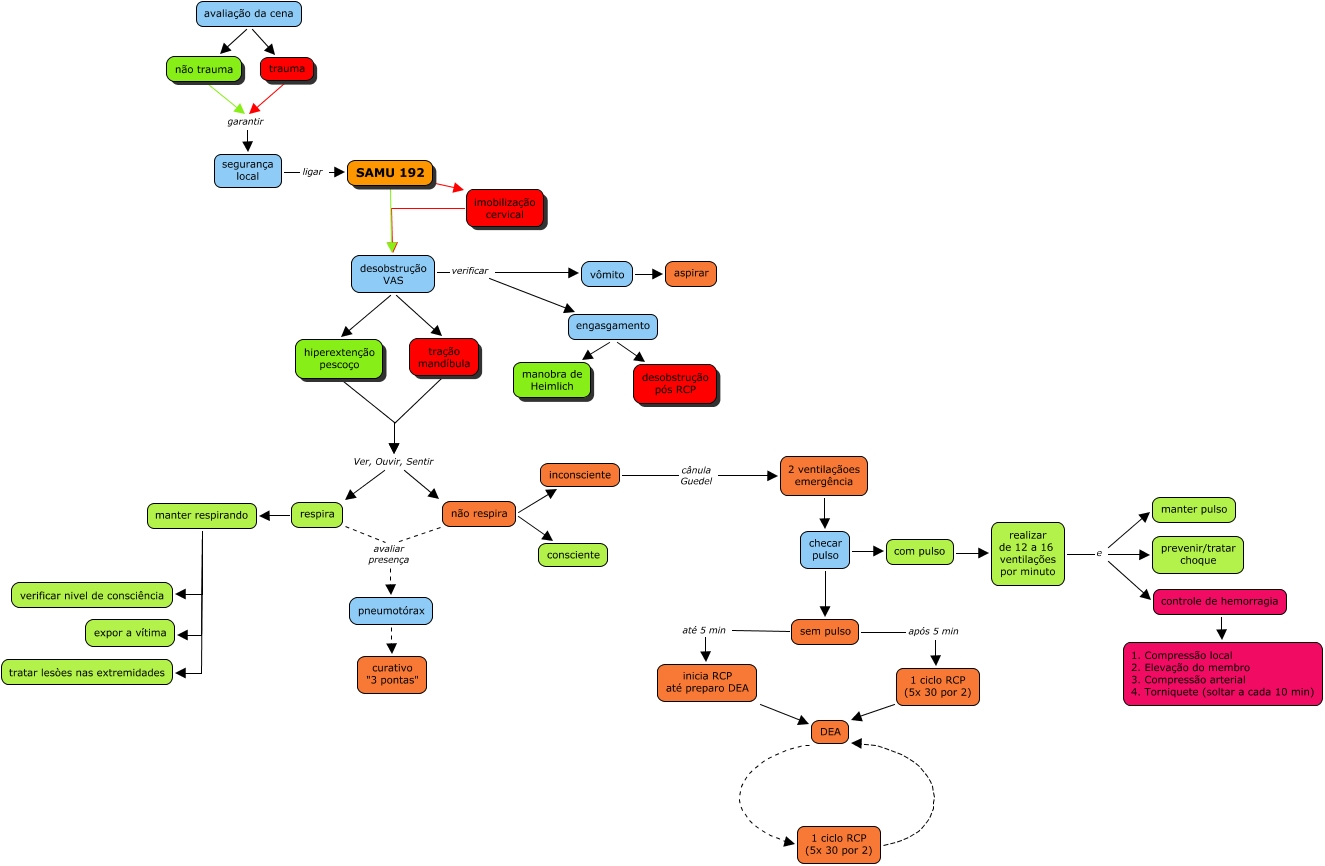 Esse mapa conceitual, produzido no IHMC CmapTools, tem a informação relacionada a: Urgência, realizar de 12 a 16 ventilações por minuto e manter pulso, avaliação da cena trauma, vômito aspirar, 1 ciclo RCP (5x 30 por 2) DEA, com pulso realizar de 12 a 16 ventilações por minuto, hiperextenção pescoço Ver, Ouvir, Sentir não respira, engasgamento manobra de Heimlich, pneumotórax curativo "3 pontas", inconsciente cânula Guedel 2 ventilaçãoes emergência, 2 ventilaçãoes emergência checar pulso, manter respirando tratar lesòes nas extremidades, avaliação da cena não trauma, manter respirando verificar nivel de consciência, tração mandíbula Ver, Ouvir, Sentir respira, inicia RCP até preparo DEA DEA, checar pulso sem pulso, desobstrução VAS hiperextenção pescoço, sem pulso até 5 min inicia RCP até preparo DEA, não respira inconsciente, não trauma garantir segurança local