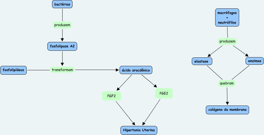 Esse mapa conceitual, produzido no IHMC CmapTools, tem a informação relacionada a: bolsa rota, fosfolipídeos transformam ácido aracdônico, enzimas quebram colágeno da membrana, bactérias produzem fosfolipase A2, ácido aracdônico PGF2 Hipertonia Uterina, elastase quebram colágeno da membrana, ácido aracdônico PGE2 Hipertonia Uterina, macrófagos + neutrófilos produzem elastase, macrófagos + neutrófilos produzem enzimas, fosfolipase A2 transformam ácido aracdônico