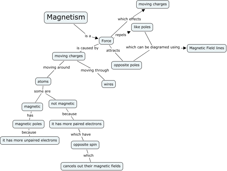 This Concept Map, created with IHMC CmapTools, has information related to: PostMagnetism_2009, atoms some are magnetic, it has more paired electrons which have opposite spin, atoms some are not magnetic, magnetic has magnetic poles, like poles which can be diagramed using Magnetic Field lines, Force is caused by moving charges, opposite poles which can be diagramed using Magnetic Field lines, Force attracts opposite poles, Force which effects moving charges, opposite spin which cancels out their magnetic fields, Force repels like poles, Magnetism is a Force, moving charges moving around atoms, magnetic poles because it has more unpaired electrons, moving charges moving through wires, not magnetic because it has more paired electrons