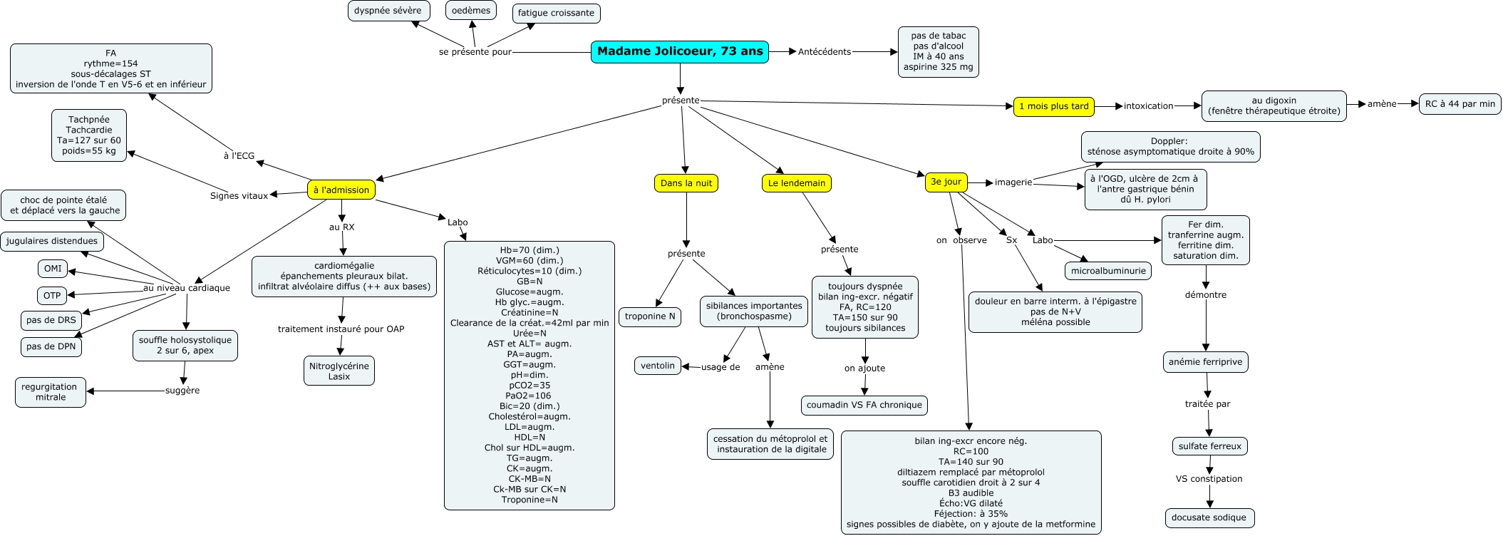 Cette carte de concepts créée avec IHMC CmapTools traite de: APP5 Multi, toujours dyspnée bilan ing-excr. négatif FA, RC=120 TA=150 sur 90 toujours sibilances on ajoute coumadin VS FA chronique, anémie ferriprive traitée par sulfate ferreux, Dans la nuit présente sibilances importantes (bronchospasme), à l'admission à l'ECG FA rythme=154 sous-décalages ST inversion de l'onde T en V5-6 et en inférieur, 3e jour imagerie à l'OGD, ulcère de 2cm à l'antre gastrique bénin dû H. pylori, à l'admission Signes vitaux Tachpnée Tachcardie Ta=127 sur 60 poids=55 kg, 3e jour Sx douleur en barre interm. à l'épigastre pas de N+V méléna possible, 3e jour on observe bilan ing-excr encore nég. RC=100 TA=140 sur 90 diltiazem remplacé par métoprolol souffle carotidien droit à 2 sur 4 B3 audible Écho:VG dilaté Féjection: à 35% signes possibles de diabète, on y ajoute de la metformine, Madame Jolicoeur, 73 ans se présente pour oedèmes, 3e jour imagerie Doppler: sténose asymptomatique droite à 90%, 1 mois plus tard intoxication au digoxin (fenêtre thérapeutique étroite), à l'admission au niveau cardiaque OTP, Madame Jolicoeur, 73 ans Antécédents pas de tabac pas d'alcool IM à 40 ans aspirine 325 mg, à l'admission au niveau cardiaque OMI, au digoxin (fenêtre thérapeutique étroite) amène RC à 44 par min, à l'admission au niveau cardiaque pas de DRS, Madame Jolicoeur, 73 ans se présente pour dyspnée sévère, souffle holosystolique 2 sur 6, apex suggère regurgitation mitrale, Madame Jolicoeur, 73 ans présente à l'admission, à l'admission Labo Hb=70 (dim.) VGM=60 (dim.) Réticulocytes=10 (dim.) GB=N Glucose=augm. Hb glyc.=augm. Créatinine=N Clearance de la créat.=42ml par min Urée=N AST et ALT= augm. PA=augm. GGT=augm. pH=dim. pCO2=35 PaO2=106 Bic=20 (dim.) Cholestérol=augm. LDL=augm. HDL=N Chol sur HDL=augm. TG=augm. CK=augm. CK-MB=N Ck-MB sur CK=N Troponine=N