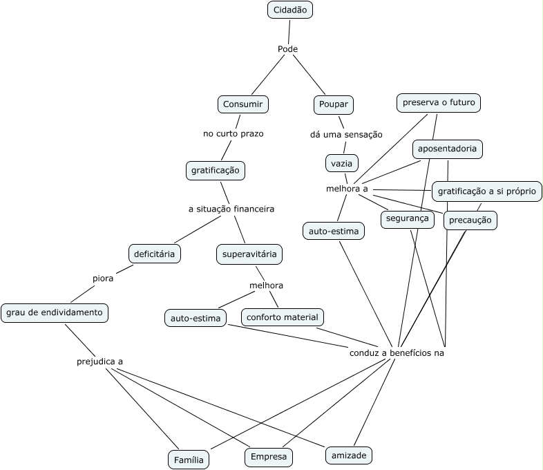 Esse mapa conceitual, produzido no IHMC CmapTools, tem a informação relacionada a: ConsumirXPoupar, grau de endividamento prejudica a Família, segurança conduz a benefícios na amizade, aposentadoria conduz a benefícios na Empresa, auto-estima conduz a benefícios na amizade, conforto material conduz a benefícios na Empresa, preserva o futuro conduz a benefícios na Empresa, precaução conduz a benefícios na Empresa, grau de endividamento prejudica a Empresa, precaução conduz a benefícios na amizade, preserva o futuro conduz a benefícios na amizade, gratificação a si próprio conduz a benefícios na amizade, conforto material conduz a benefícios na Família, gratificação a si próprio conduz a benefícios na Família, precaução conduz a benefícios na Família, Cidadão Pode Consumir, segurança conduz a benefícios na Família, vazia melhora a precaução, superavitária melhora auto-estima, auto-estima conduz a benefícios na Família, gratificação a situação financeira deficitária