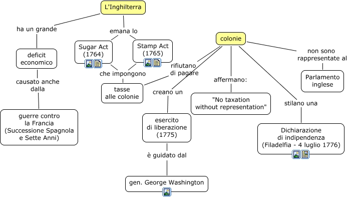 Questa Cmap, creata con IHMC CmapTools, contiene informazioni relative a: 270) Colonie americane - L'indipendenza, colonie affermano: "No taxation without representation", L'Inghilterra emana lo Sugar Act (1764), colonie creano un esercito di liberazione (1775), colonie stilano una Dichiarazione di indipendenza (Filadelfia - 4 luglio 1776), Stamp Act (1765) che impongono tasse alle colonie, Sugar Act (1764) che impongono tasse alle colonie, colonie rifiutano di pagare tasse alle colonie, L'Inghilterra emana lo Stamp Act (1765), deficit economico causato anche dalla guerre contro la Francia (Successione Spagnola e Sette Anni), esercito di liberazione (1775) è guidato dal gen. George Washington, L'Inghilterra ha un grande deficit economico, colonie non sono rappresentate al Parlamento inglese