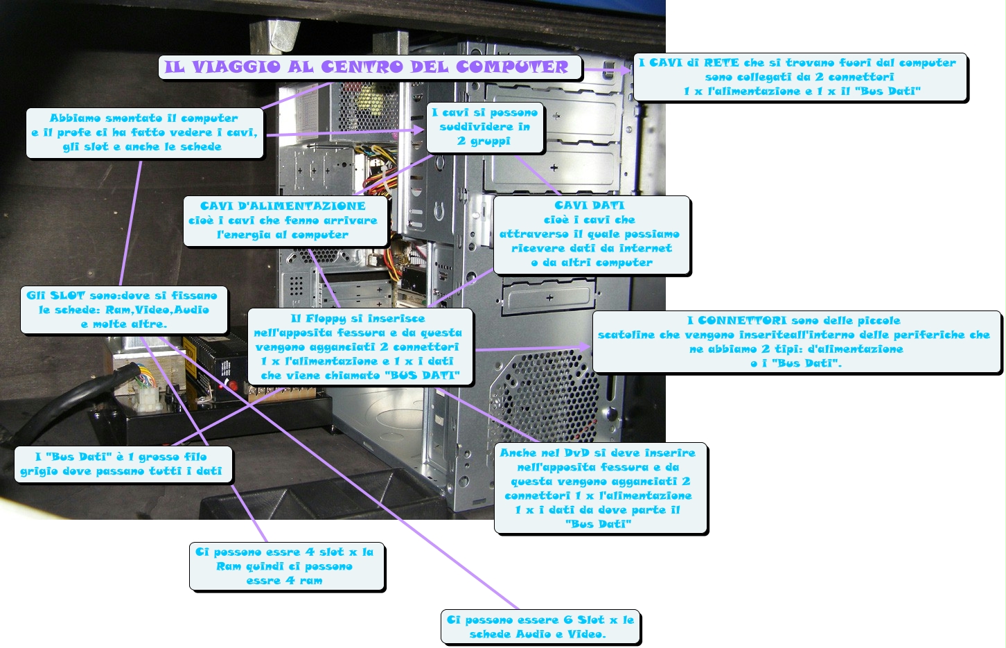 Questa Cmap, creata con IHMC CmapTools, contiene informazioni relative a: Il viaggio al centro del computer, I cavi si possono suddividere in 2 gruppi ???? CAVI D'ALIMENTAZIONE cioè i cavi che fenno arrivare l'energia al computer, CAVI D'ALIMENTAZIONE cioè i cavi che fenno arrivare l'energia al computer ???? Il Floppy si inserisce nell'apposita fessura e da questa vengono agganciati 2 connettori 1 x l'alimentazione e 1 x i dati che viene chiamato "BUS DATI", IL VIAGGIO AL CENTRO DEL COMPUTER ???? I CAVI di RETE che si trovano fuori dal computer sono collegati da 2 connettori 1 x l'alimentazione e 1 x il "Bus Dati", I cavi si possono suddividere in 2 gruppi ???? CAVI DATI cioè i cavi che attraverso il quale possiamo ricevere dati da internet o da altri computer, Gli SLOT sono:dove si fissano le schede: Ram,Video,Audio e molte altre. ???? Ci possono essere 6 Slot x le schede Audio e Video., Abbiamo smontato il computer e il profe ci ha fatto vedere i cavi, gli slot e anche le schede ???? Gli SLOT sono:dove si fissano le schede: Ram,Video,Audio e molte altre., Il Floppy si inserisce nell'apposita fessura e da questa vengono agganciati 2 connettori 1 x l'alimentazione e 1 x i dati che viene chiamato "BUS DATI" ???? I "Bus Dati" è 1 grosso filo grigio dove passano tutti i dati, CAVI DATI cioè i cavi che attraverso il quale possiamo ricevere dati da internet o da altri computer ???? Il Floppy si inserisce nell'apposita fessura e da questa vengono agganciati 2 connettori 1 x l'alimentazione e 1 x i dati che viene chiamato "BUS DATI", IL VIAGGIO AL CENTRO DEL COMPUTER ???? Abbiamo smontato il computer e il profe ci ha fatto vedere i cavi, gli slot e anche le schede, Abbiamo smontato il computer e il profe ci ha fatto vedere i cavi, gli slot e anche le schede ???? I cavi si possono suddividere in 2 gruppi, Il Floppy si inserisce nell'apposita fessura e da questa vengono agganciati 2 connettori 1 x l'alimentazione e 1 x i dati che viene chiamato "BUS DATI" ???? I CONNETTORI sono delle piccole scatoline che vengono inseriteall'interno delle periferiche che ne abbiamo 2 tipi: d'alimentazione o i "Bus Dati"., Il Floppy si inserisce nell'apposita fessura e da questa vengono agganciati 2 connettori 1 x l'alimentazione e 1 x i dati che viene chiamato "BUS DATI" ???? Anche nel DvD si deve inserire nell'apposita fessura e da questa vengono agganciati 2 connettori 1 x l'alimentazione 1 x i dati da dove parte il "Bus Dati", Gli SLOT sono:dove si fissano le schede: Ram,Video,Audio e molte altre. ???? Ci possono essre 4 slot x la Ram quindi ci possono essre 4 ram