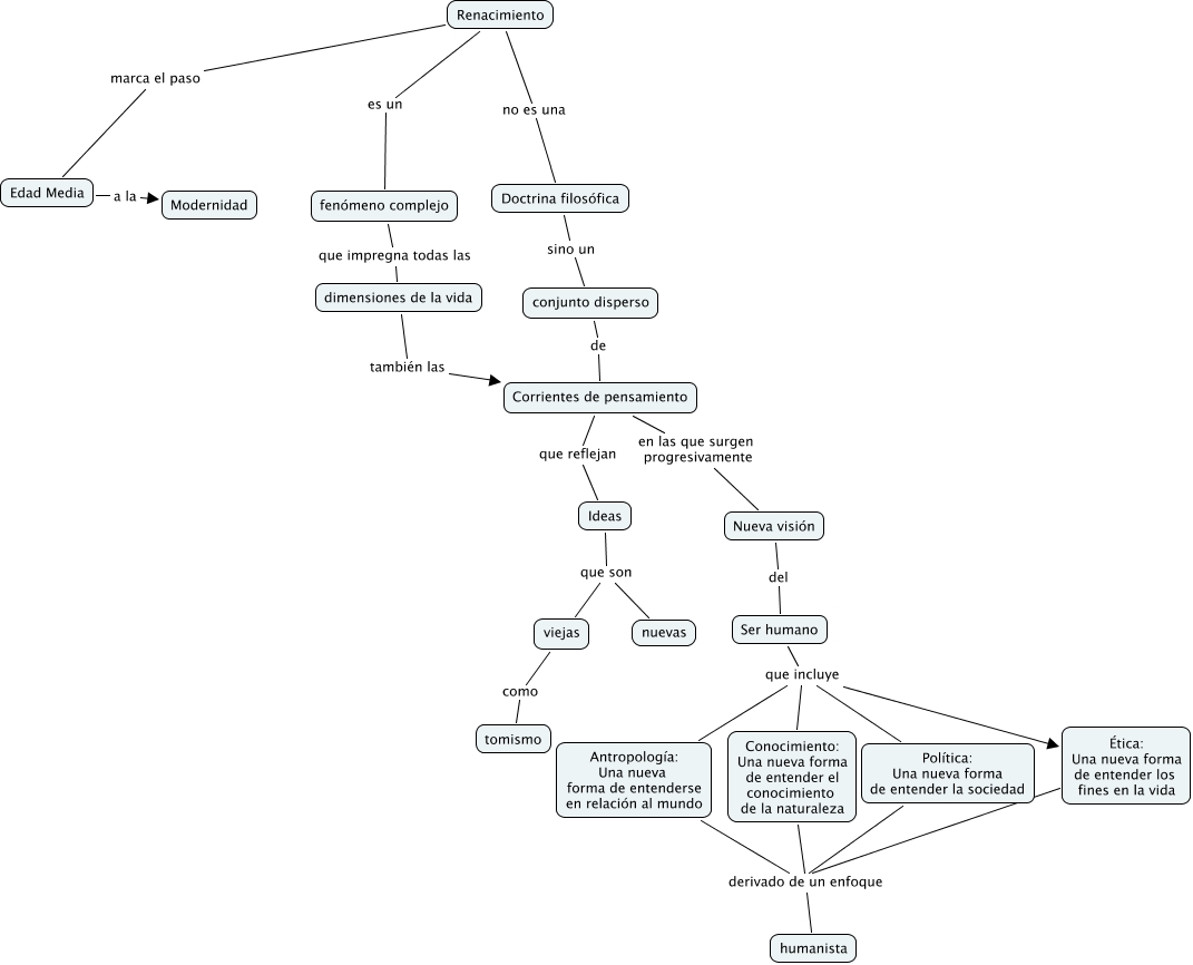 Este Cmap, tiene información relacionada con: Renacimiento Intro, Ser humano que incluye Antropología: Una nueva forma de entenderse en relación al mundo, Ser humano que incluye Conocimiento: Una nueva forma de entender el conocimiento de la naturaleza, conjunto disperso de Corrientes de pensamiento, Renacimiento marca el paso Edad Media, Renacimiento no es una Doctrina filosófica, Ser humano que incluye Política: Una nueva forma de entender la sociedad, fenómeno complejo que impregna todas las dimensiones de la vida, Corrientes de pensamiento que reflejan Ideas, Política: Una nueva forma de entender la sociedad derivado de un enfoque humanista, Corrientes de pensamiento en las que surgen progresivamente Nueva visión, Renacimiento es un fenómeno complejo, dimensiones de la vida también las Corrientes de pensamiento, Ideas que son nuevas, Doctrina filosófica sino un conjunto disperso, Nueva visión del Ser humano, Edad Media a la Modernidad, Conocimiento: Una nueva forma de entender el conocimiento de la naturaleza derivado de un enfoque humanista, Ideas que son viejas, Ética: Una nueva forma de entender los fines en la vida derivado de un enfoque humanista, Ser humano que incluye Ética: Una nueva forma de entender los fines en la vida