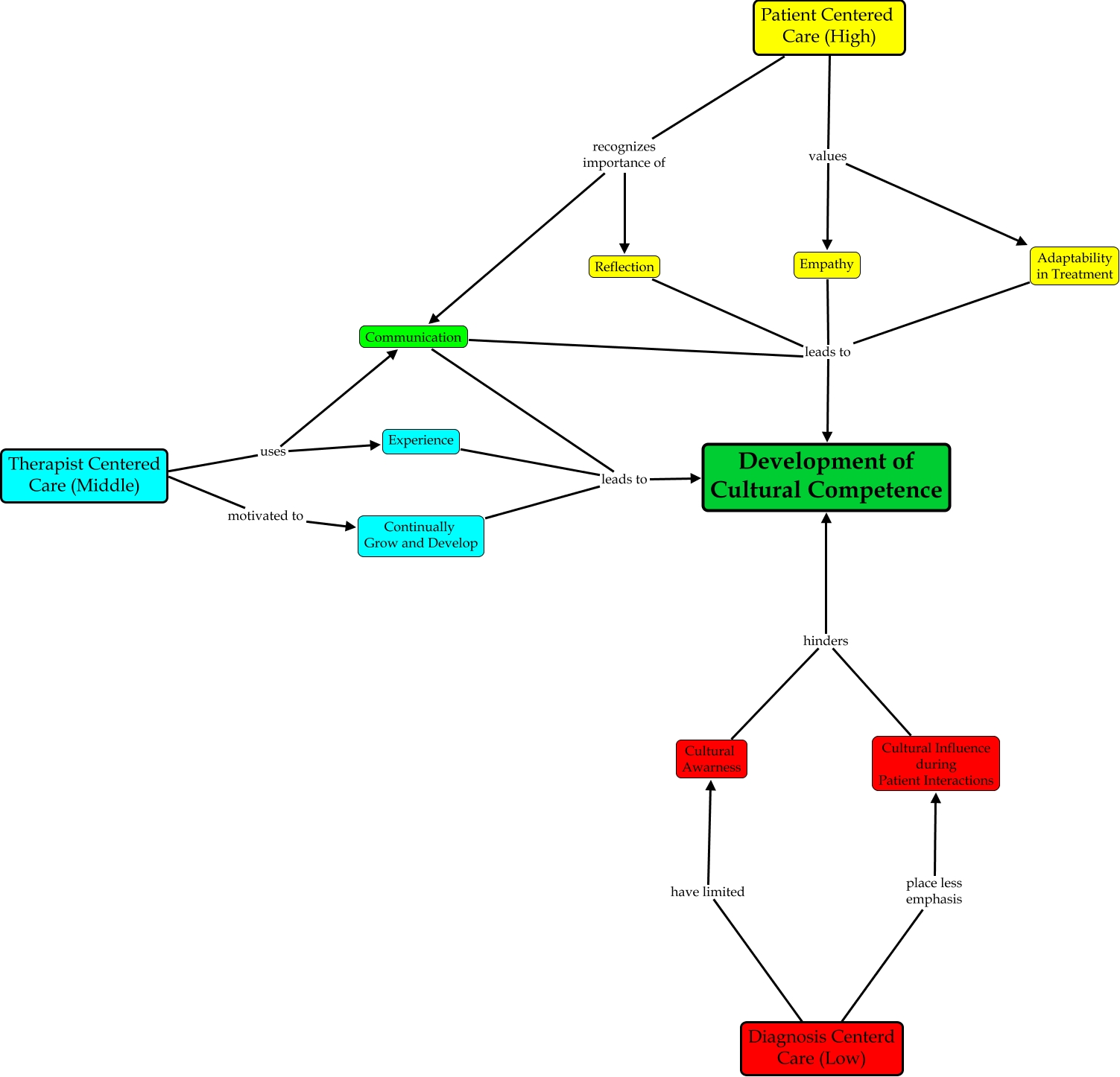 This Concept Map, created with IHMC CmapTools, has information related to: Development of Cultural Competence Combined Draft 5-11-09, Adaptability in Treatment leads to Development of Cultural Competence, Continually Grow and Develop leads to Development of Cultural Competence, Therapist Centered Care (Middle) uses Experience, Therapist Centered Care (Middle) motivated to Continually Grow and Develop, Communication leads to Development of Cultural Competence, Patient Centered Care (High) recognizes importance of Communication, Cultural Influence during Patient Interactions hinders Development of Cultural Competence, Cultural Awarness hinders Development of Cultural Competence, Diagnosis Centerd Care (Low) have limited Cultural Awarness, Diagnosis Centerd Care (Low) place less emphasis Cultural Influence during Patient Interactions, Empathy leads to Development of Cultural Competence, Patient Centered Care (High) values Adaptability in Treatment, Experience leads to Development of Cultural Competence, Therapist Centered Care (Middle) uses Communication, Communication leads to Development of Cultural Competence, Patient Centered Care (High) recognizes importance of Reflection, Reflection leads to Development of Cultural Competence, Patient Centered Care (High) values Empathy