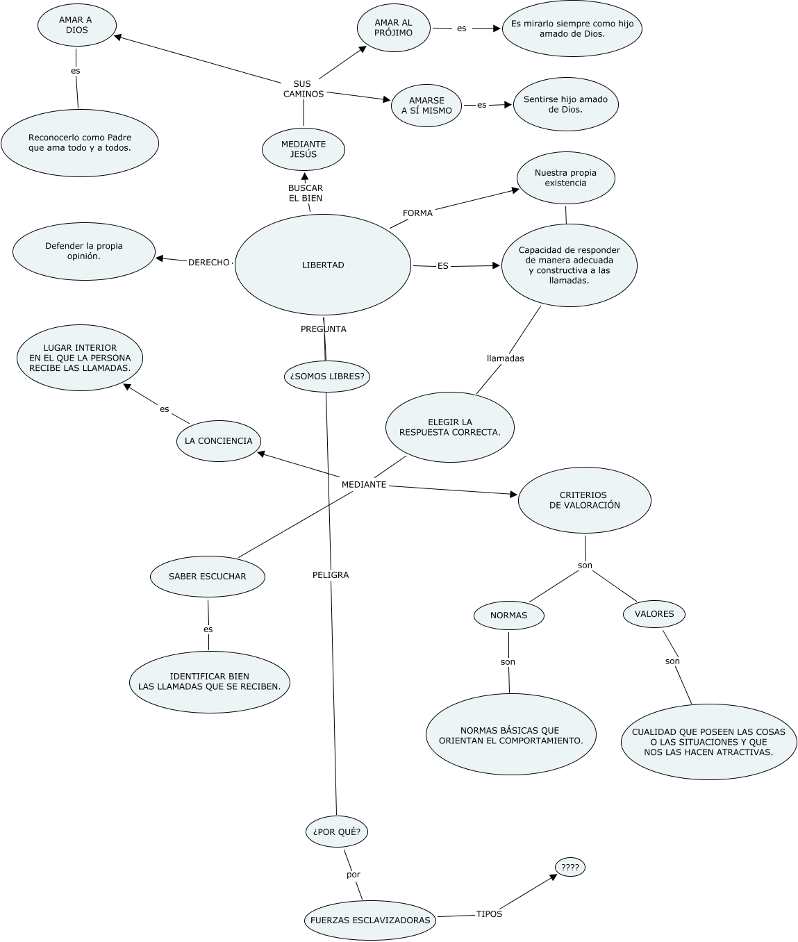 Este Cmap, tiene información relacionada con: La libertad (Luis Francisco Herranz), LIBERTAD DERECHO Defender la propia opinión., ¿POR QUÉ? por FUERZAS ESCLAVIZADORAS, LIBERTAD FORMA Nuestra propia existencia, Capacidad de responder de manera adecuada y constructiva a las llamadas. llamadas ELEGIR LA RESPUESTA CORRECTA., CRITERIOS DE VALORACIÓN son VALORES, LIBERTAD PELIGRA ¿POR QUÉ?, ELEGIR LA RESPUESTA CORRECTA. MEDIANTE CRITERIOS DE VALORACIÓN, SABER ESCUCHAR es IDENTIFICAR BIEN LAS LLAMADAS QUE SE RECIBEN., MEDIANTE JESÚS SUS CAMINOS AMARSE A SÍ MISMO, LIBERTAD PREGUNTA ¿SOMOS LIBRES?, AMARSE A SÍ MISMO es Sentirse hijo amado de Dios., ELEGIR LA RESPUESTA CORRECTA. MEDIANTE SABER ESCUCHAR, CRITERIOS DE VALORACIÓN son NORMAS, FUERZAS ESCLAVIZADORAS TIPOS ????, NORMAS son NORMAS BÁSICAS QUE ORIENTAN EL COMPORTAMIENTO., LIBERTAD BUSCAR EL BIEN MEDIANTE JESÚS, AMAR A DIOS es Reconocerlo como Padre que ama todo y a todos., LA CONCIENCIA es LUGAR INTERIOR EN EL QUE LA PERSONA RECIBE LAS LLAMADAS., MEDIANTE JESÚS SUS CAMINOS AMAR AL PRÓJIMO, LIBERTAD ES Capacidad de responder de manera adecuada y constructiva a las llamadas.