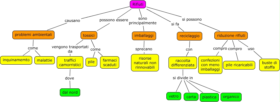 Questa Cmap, creata con IHMC CmapTools, contiene informazioni relative a: Rifiuti, Rifiuti si fa reciclaggio, problemi ambientali come inquinamemto, riduzione rifiuti compro confezioni con meno imballaggi, tossici vengono trasportati da traffici camorristici, tossici come farmaci scaduti, raccolta differenziata si divide in carta, problemi ambientali come malattie, Rifiuti causano problemi ambientali, reciclaggio con raccolta differenziata, raccolta differenziata si divide in vetro, Rifiuti si possono riduzione rifiuti, traffici camorristici dove dal nord, Rifiuti sono principalmente imballaggi, Rifiuti possono essere tossici, tossici come pile, raccolta differenziata si divide in plastica, riduzione rifiuti uso buste di stoffa, riduzione rifiuti compro pile ricaricabili, imballaggi sprecano risorse naturali non rinnovabili, raccolta differenziata si divide in organico