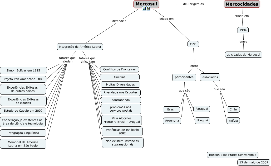 Esse mapa conceitual, produzido no IHMC CmapTools, tem a informação relacionada a: Mercosul, 1991 entre associados, integração da América Latina fatores que ajudam Simon Bolívar em 1815, participantes que são Argentina, Brasil que são Paraguai, Mercocidades criada em 1994, Brasil que são Uruguai, participantes que são Paraguai, integração da América Latina fatores que ajudam Estudo de Capelo em 2000, integração da América Latina fatores que ajudam Experiências Exitosas de outros países, integração da América Latina fatores que ajudam Projeto Pan Americano 1889, integração da América Latina fatores que dificultam Não existem instâncias supranacionais, integração da América Latina fatores que dificultam contrabando, Mercosul deu origem às Mercocidades, integração da América Latina fatores que ajudam Integração Linguística, integração da América Latina fatores que dificultam Conflitos de Fronteiras, integração da América Latina fatores que dificultam Guerras, participantes que são Uruguai, integração da América Latina fatores que ajudam Memorial da América Latina em São Paulo, 1994 entre as cidades do Mercosul, integração da América Latina fatores que dificultam problemas nos serviços postais