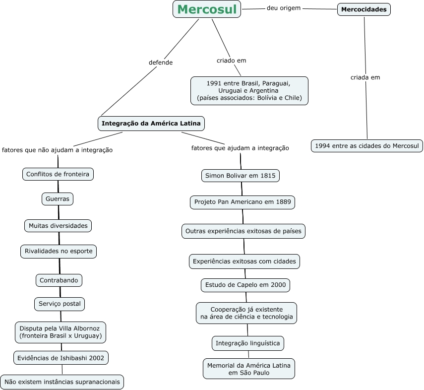 Esse mapa conceitual, produzido no IHMC CmapTools, tem a informação relacionada a: Mercosul, Integração da América Latina fatores que não ajudam a integração Contrabando, Integração da América Latina fatores que não ajudam a integração Rivalidades no esporte, Integração da América Latina fatores que ajudam a integração Cooperação já existente na área de ciência e tecnologia, Integração da América Latina fatores que ajudam a integração Estudo de Capelo em 2000, Integração da América Latina fatores que ajudam a integração Outras experiências exitosas de países, Integração da América Latina fatores que não ajudam a integração Disputa pela Villa Albornoz (fronteira Brasil x Uruguay), Integração da América Latina fatores que ajudam a integração Projeto Pan Americano em 1889, Integração da América Latina fatores que ajudam a integração Simon Bolivar em 1815, Mercosul defende Integração da América Latina, Integração da América Latina fatores que ajudam a integração Integração linguística, Integração da América Latina fatores que não ajudam a integração Não existem instâncias supranacionais, Integração da América Latina fatores que não ajudam a integração Guerras, Integração da América Latina fatores que não ajudam a integração Conflitos de fronteira, Mercocidades criada em 1994 entre as cidades do Mercosul, Integração da América Latina fatores que não ajudam a integração Muitas diversidades, Integração da América Latina fatores que não ajudam a integração Serviço postal, Integração da América Latina fatores que ajudam a integração Memorial da América Latina em São Paulo, Integração da América Latina fatores que ajudam a integração Experiências exitosas com cidades, Integração da América Latina fatores que não ajudam a integração Evidências de Ishibashi 2002, Mercosul deu origem Mercocidades