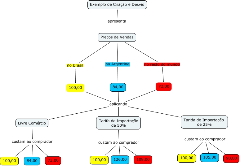 Esse mapa conceitual, produzido no IHMC CmapTools, tem a informação relacionada a: Exemplo de Criação e Desvio, Tarida de Importação de 25% custam ao comprador 100,00, Livre Comércio custam ao comprador 72,00, Tarida de Importação de 25% custam ao comprador 105,00, 100,00 aplicando Tarida de Importação de 25%, Exemplo de Criação e Desvio apresenta Preços de Vendas, Livre Comércio custam ao comprador 100,00, 100,00 aplicando Livre Comércio, 72,00 aplicando Livre Comércio, 84,00 aplicando Tarida de Importação de 25%, Tarifa de Importação de 50% custam ao comprador 108,00, Livre Comércio custam ao comprador 84,00, 72,00 aplicando Tarida de Importação de 25%, 100,00 aplicando Tarifa de Importação de 50%, Tarida de Importação de 25% custam ao comprador 90,00, Preços de Vendas na Argentina 84,00, 72,00 aplicando Tarifa de Importação de 50%, 84,00 aplicando Tarifa de Importação de 50%, 84,00 aplicando Livre Comércio, Tarifa de Importação de 50% custam ao comprador 100,00, Preços de Vendas no resto do mundo 72,00