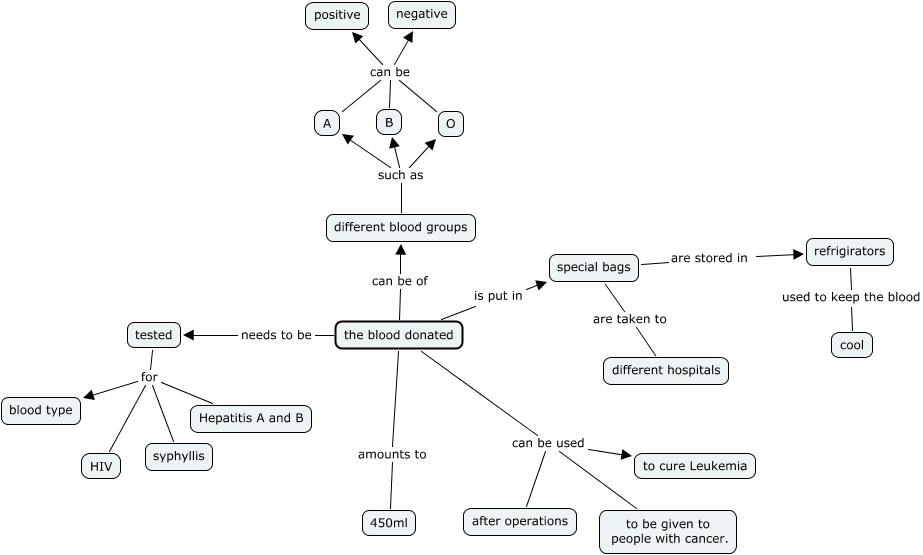 This Concept Map, created with IHMC CmapTools, has information related to: CHRISTINE POST, the blood donated can be of different blood groups, special bags are taken to different hospitals, tested for blood type, the blood donated needs to be tested, B can be negative, A can be negative, tested for syphyllis, tested for Hepatitis A and B, different blood groups such as B, different blood groups such as O, B can be positive, refrigirators used to keep the blood cool, the blood donated is put in special bags, tested for HIV, the blood donated amounts to 450ml, A can be positive, different blood groups such as A, the blood donated can be used to cure Leukemia, O can be negative, O can be positive