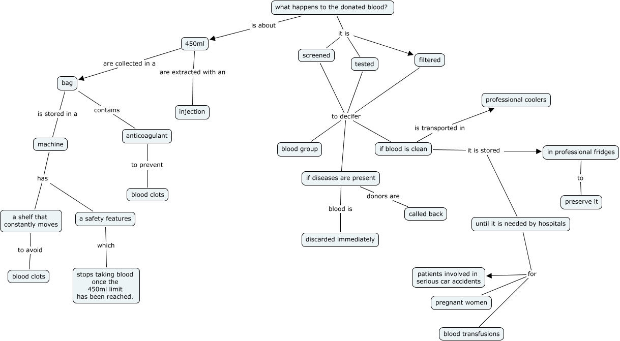 This Concept Map, created with IHMC CmapTools, has information related to: AMANDA POST, until it is needed by hospitals for pregnant women, until it is needed by hospitals for patients involved in serious car accidents, a safety features which stops taking blood once the 450ml limit has been reached., filtered to decifer if blood is clean, what happens to the donated blood? it is filtered, bag is stored in a machine, what happens to the donated blood? it is screened, if blood is clean is transported in professional coolers, tested to decifer blood group, what happens to the donated blood? is about 450ml, if diseases are present donors are called back, what happens to the donated blood? it is tested, a shelf that constantly moves to avoid blood clots, if blood is clean it is stored in professional fridges, if diseases are present blood is discarded immediately, tested to decifer if diseases are present, 450ml are collected in a bag, tested to decifer if blood is clean, machine has a safety features, machine has a shelf that constantly moves