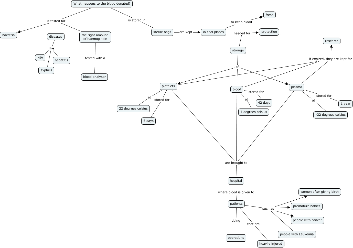 This Concept Map, created with IHMC CmapTools, has information related to: LINUS POST, storage of platelets, hospital where blood is given to patients, diseases like syphilis, What happens to the blood donated? is tested for bacteria, platelets if expired, they are kept for research, blood if expired, they are kept for research, What happens to the blood donated? is stored in sterile bags, blood at 4 degrees celsius, in cool places needed for storage, blood stored for 42 days, diseases like HIV, patients that are heavily injured, plasma are brought to hospital, platelets at 22 degrees celsius, patients such as women after giving birth, patients doing operations, in cool places to keep blood fresh, platelets stored for 5 days, plasma if expired, they are kept for research, storage of blood