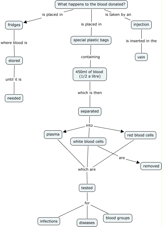 This Concept Map, created with IHMC CmapTools, has information related to: REBECCA POST, What happens to the blood donated? is taken by an injection, special plastic bags containing 450ml of blood (1/2 a litre), tested for diseases, red blood cells which are tested, tested for infections, tested for blood groups, white blood cells which are tested, stored until it is needed, white blood cells are removed, separated into red blood cells, injection is inserted in the vein, What happens to the blood donated? is placed in fridges, separated into white blood cells, fridges where blood is stored, separated into plasma, What happens to the blood donated? is placed in special plastic bags, plasma which are tested, 450ml of blood (1/2 a litre) which is then separated