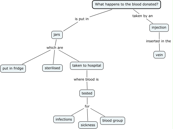 This Concept Map, created with IHMC CmapTools, has information related to: REBECCA PRE, What happens to the blood donated? taken by an injection, taken to hospital where blood is tested, tested for blood group, tested for sickness, injection inserted in the vein, jars which are put in fridge, jars which are sterilised, What happens to the blood donated? is put in jars, tested for infections, jars which are taken to hospital