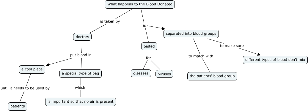 This Concept Map, created with IHMC CmapTools, has information related to: BERNICE PRE, What happens to the Blood Donated is tested, a cool place until it needs to be used by patients, doctors put blood in a special type of bag, separated into blood groups to match with the patients' blood group, a special type of bag which is important so that no air is present, What happens to the Blood Donated is separated into blood groups, doctors put blood in a cool place, tested for diseases, tested for viruses, What happens to the Blood Donated is taken by doctors, separated into blood groups to make sure different types of blood don't mix