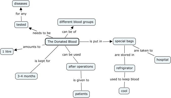 This Concept Map, created with IHMC CmapTools, has information related to: CHRISTINE PRE, special bags are taken to hospital, The Donated Blood can be of different blood groups, The Donated Blood needs to be tested, The Donated Blood can be used after operations, refrigirator used to keep blood cool, The Donated Blood is put in special bags, The Donated Blood is kept for 3-4 months, The Donated Blood amounts to 1 litre, special bags are stored in refrigirator, after operations is given to patients, tested for any diseases