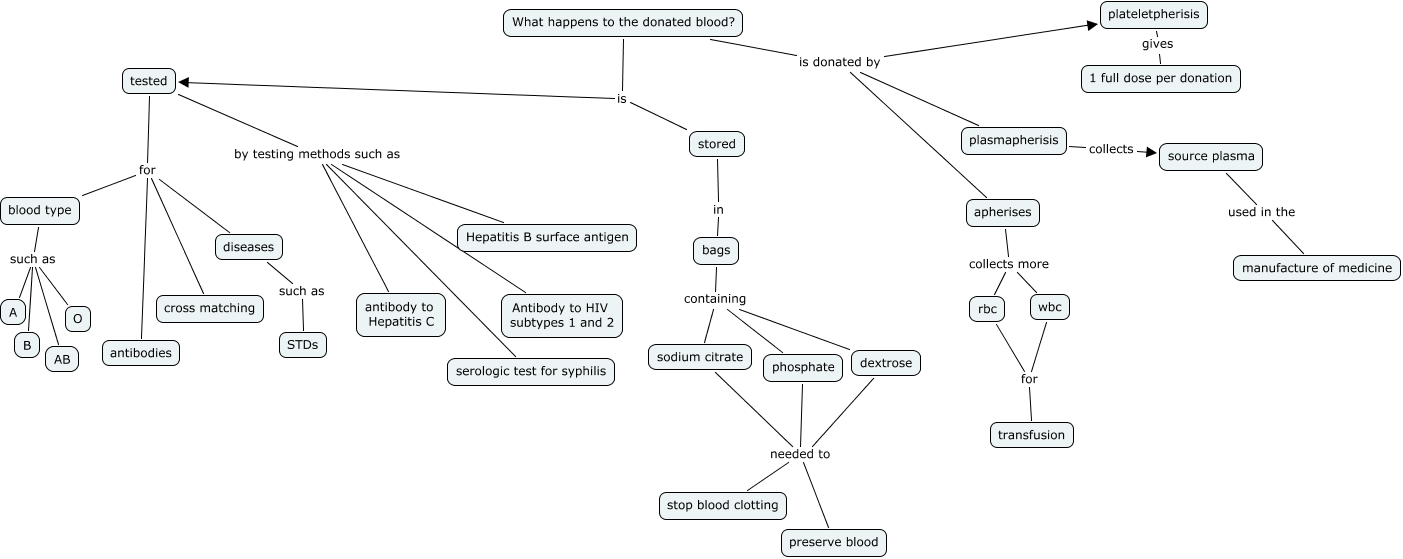 This Concept Map, created with IHMC CmapTools, has information related to: SOPHIE C PRE, tested for diseases, blood type such as A, blood type such as AB, tested for cross matching, What happens to the donated blood? is donated by plateletpherisis, What happens to the donated blood? is donated by apherises, phosphate needed to stop blood clotting, dextrose needed to stop blood clotting, What happens to the donated blood? is stored, plasmapherisis collects source plasma, tested for antibodies, stored in bags, bags containing sodium citrate, tested by testing methods such as Hepatitis B surface antigen, rbc for transfusion, blood type such as O, tested by testing methods such as serologic test for syphilis, phosphate needed to preserve blood, tested by testing methods such as antibody to Hepatitis C, source plasma used in the manufacture of medicine