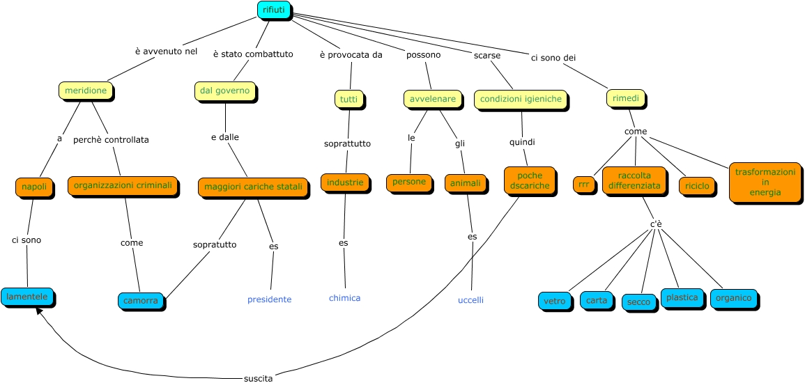 Questa Cmap, creata con IHMC CmapTools, contiene informazioni relative a: Rifiuti, rifiuti possono avvelenare, meridione a napoli, meridione perchè controllata organizzazioni criminali, rifiuti scarse condizioni igieniche, rimedi come rrr, raccolta differenziata c'è organico, avvelenare le persone, raccolta differenziata c'è carta, dal governo e dalle maggiori cariche statali, napoli ci sono lamentele, maggiori cariche statali es presidente, rifiuti è avvenuto nel meridione, animali es uccelli, maggiori cariche statali sopratutto camorra, poche dscariche suscita lamentele, raccolta differenziata c'è plastica, rifiuti è provocata da tutti, raccolta differenziata c'è secco, rimedi come raccolta differenziata, rimedi come riciclo