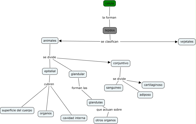 Este Cmap, tiene información relacionada con: la celula, epitelial cubren cavidad interna, animales se divide conjuntivo, epitelial cubren organos, glandulas que actuan sobre otros organos, animales se divide glandular, tejidos se clasifican animales, epitelial cubren superficie del cuerpo, conjuntivo se divide cartilaginoso, animales se divide epitelial, conjuntivo se divide sanguineo, tejidos se clasifican vejetales, conjuntivo se divide adiposo, celula la forman tejidos, glandular forman las glandulas
