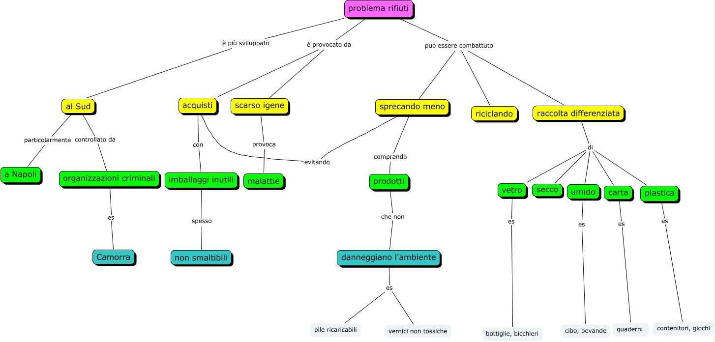 Questa Cmap, creata con IHMC CmapTools, contiene informazioni relative a: Rifiuti, plastica es contenitori, giochi, danneggiano l'ambiente es vernici non tossiche, acquisti con imballaggi inutili, sprecando meno evitando acquisti, vetro es bottiglie, bicchieri, raccolta differenziata di plastica, umido es cibo, bevande, problema rifiuti è provocato da scarso igene, scarso igene provoca malattie, problema rifiuti può essere combattuto raccolta differenziata, raccolta differenziata di secco, problema rifiuti è provocato da acquisti, problema rifiuti è più sviluppato al Sud, problema rifiuti può essere combattuto riciclando, problema rifiuti può essere combattuto sprecando meno, raccolta differenziata di umido, al Sud controllato da organizzazioni criminali, prodotti che non danneggiano l'ambiente, imballaggi inutili spesso non smaltibili, organizzazioni criminali es Camorra