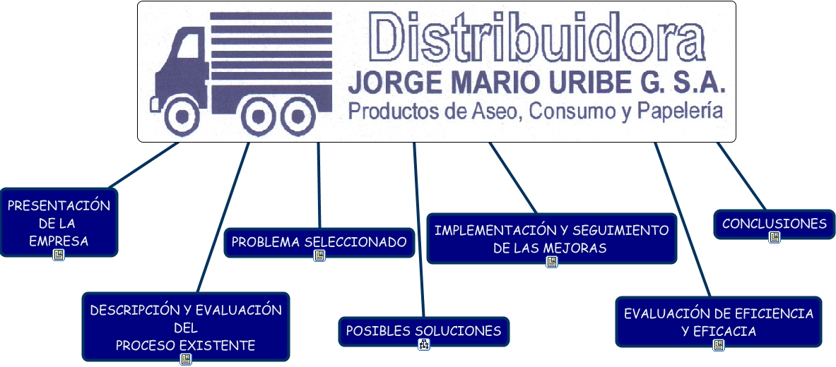 Este Cmap, tiene información relacionada con: DISTRIBUIDORA JORGE MARIO URIBE, ???? IMPLEMENTACIÓN Y SEGUIMIENTO DE LAS MEJORAS, ???? EVALUACIÓN DE EFICIENCIA Y EFICACIA, ???? PROBLEMA SELECCIONADO, ???? PRESENTACIÓN DE LA EMPRESA, ???? DESCRIPCIÓN Y EVALUACIÓN DEL PROCESO EXISTENTE, ???? CONCLUSIONES, ???? POSIBLES SOLUCIONES
