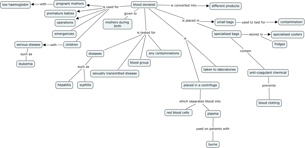 This Concept Map, created with IHMC CmapTools, has information related to: NICOLE C POST, specialised bags stored in fridges, blood donated is placed in a centrifuge, blood donated is tested for any contaminations, placed in a centrifuge which separates blood into red blood cells, blood donated is used for emergencies, blood donated is tested for blood group, diseases such as hepatitis, pregnant mothers with low haemoglobin, blood donated is tested for diseases, blood donated is converted into different products, blood donated is used for children, blood donated is used for premature babies, small bags used to test for contamination, diseases such as syphilis, blood donated is tested for sexually transmitted disease, plasma used on patients with burns, placed in a centrifuge which separates blood into plasma, specialised bags contain anti-coagulant chemical, blood donated is used for operations, blood donated is taken to laboratories