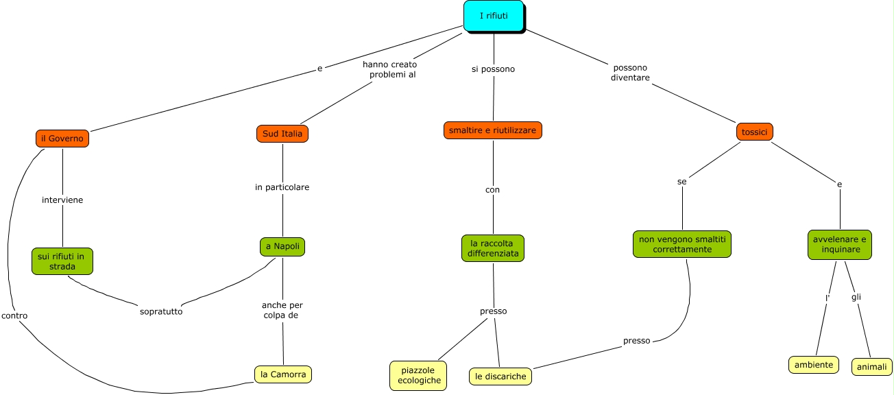 Questa Cmap, creata con IHMC CmapTools, contiene informazioni relative a: rifiuti, la raccolta differenziata presso piazzole ecologiche, il Governo contro la Camorra, tossici se non vengono smaltiti correttamente, avvelenare e inquinare l' ambiente, a Napoli anche per colpa de la Camorra, avvelenare e inquinare gli animali, tossici e avvelenare e inquinare, I rifiuti hanno creato problemi al Sud Italia, la raccolta differenziata presso le discariche, I rifiuti si possono smaltire e riutilizzare, non vengono smaltiti correttamente presso le discariche, smaltire e riutilizzare con la raccolta differenziata, I rifiuti possono diventare tossici, Sud Italia in particolare a Napoli, I rifiuti e il Governo, sui rifiuti in strada sopratutto a Napoli, il Governo interviene sui rifiuti in strada