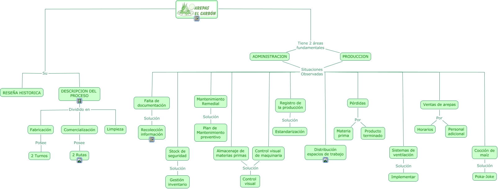 Este Cmap, tiene información relacionada con: AREPAS EL CARBON, ADMINISTRACION Situaciones Observadas Distribución espacios de trabajo, Cocción de maíz Solución Poka-Joke, ADMINISTRACION Situaciones Observadas Falta de documentación, Sistemas de ventilación Solución Implementar, DESCRIPCION DEL PROCESO Dividido en Fabricación, ADMINISTRACION Situaciones Observadas Pérdidas, ADMINISTRACION Situaciones Observadas Stock de seguridad, PRODUCCION Situaciones Observadas Registro de la producción, DESCRIPCION DEL PROCESO Dividido en Comercialización, Almacenaje de materias primas Solución Control visual, PRODUCCION Situaciones Observadas Cocción de maíz, PRODUCCION Situaciones Observadas Ventas de arepas, ADMINISTRACION Situaciones Observadas Ventas de arepas, Comercialización Posee 2 Rutas, Pérdidas Por Producto terminado, Falta de documentación Solución Recolección información, PRODUCCION Situaciones Observadas Stock de seguridad, Su RESEÑA HISTORICA, Tiene 2 áreas fundamentales PRODUCCION, PRODUCCION Situaciones Observadas Pérdidas