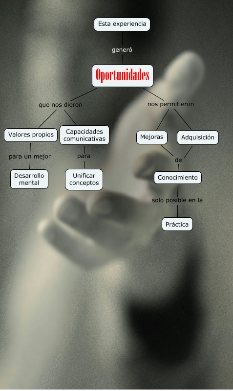 Este Cmap, tiene información relacionada con: Oportunidades, Conocimiento solo posible en la Práctica, Adquisición de Conocimiento, Oportunidades que nos dieron Capacidades comunicativas, Esta experiencia generó Oportunidades, Oportunidades que nos dieron Valores propios, Mejoras de Conocimiento, Valores propios para un mejor Desarrollo mental, Oportunidades nos permitieron Adquisición, Oportunidades nos permitieron Mejoras, Capacidades comunicativas para Unificar conceptos