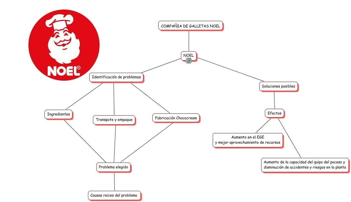 Este Cmap, tiene información relacionada con: chococreamp, Problema elegido ???? Causas raices del problema, Efectos ???? Aumento en el EGE y mejor aprovechamiento de recursos, Identificación de problemas ???? Transpote y empaque, Identificación de problemas ???? Fabricación Chococream, NOEL ???? Identificación de problemas, Soluciones posibles ???? Efectos, NOEL ???? Soluciones posibles, Identificación de problemas ???? Ingredientes, Efectos ???? Aumento de la capacidad del quipo del poceso y disminución de accidentes y riesgos en la planta, Ingredientes ???? Problema elegido, COMPAÑIA DE GALLETAS NOEL ???? NOEL, Fabricación Chococream ???? Problema elegido, Transpote y empaque ???? Problema elegido