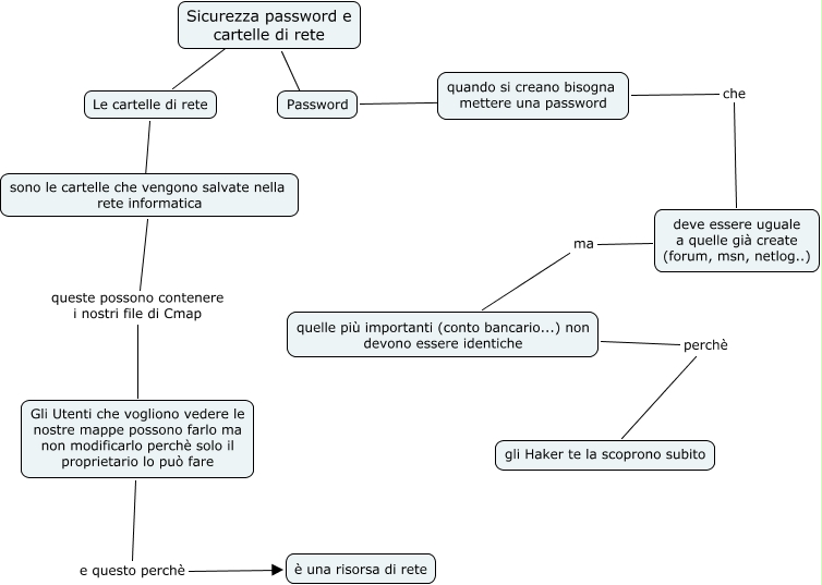 Questa Cmap, creata con IHMC CmapTools, contiene informazioni relative a: Sicurezza, deve essere uguale a quelle già create (forum, msn, netlog..) ma quelle più importanti (conto bancario...) non devono essere identiche, Le cartelle di rete ???? Sicurezza password e cartelle di rete, Password ???? quando si creano bisogna mettere una password, Sicurezza password e cartelle di rete ???? Password, sono le cartelle che vengono salvate nella rete informatica queste possono contenere i nostri file di Cmap Gli Utenti che vogliono vedere le nostre mappe possono farlo ma non modificarlo perchè solo il proprietario lo può fare, quelle più importanti (conto bancario...) non devono essere identiche perchè gli Haker te la scoprono subito, quando si creano bisogna mettere una password che deve essere uguale a quelle già create (forum, msn, netlog..), Le cartelle di rete ???? sono le cartelle che vengono salvate nella rete informatica, Gli Utenti che vogliono vedere le nostre mappe possono farlo ma non modificarlo perchè solo il proprietario lo può fare e questo perchè è una risorsa di rete