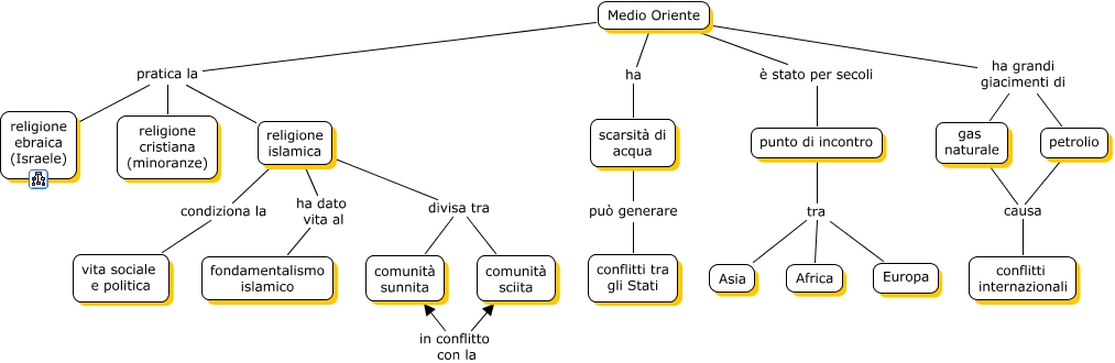 Questa Cmap, creata con IHMC CmapTools, contiene informazioni relative a: 390) Medio Oriente - inquadramento, punto di incontro tra Europa, gas naturale causa conflitti internazionali, Medio Oriente ha grandi giacimenti di petrolio, petrolio causa conflitti internazionali, Medio Oriente ha scarsità di acqua, religione islamica divisa tra comunità sciita, Medio Oriente pratica la religione ebraica (Israele), Medio Oriente pratica la religione cristiana (minoranze), Medio Oriente è stato per secoli punto di incontro, scarsità di acqua può generare conflitti tra gli Stati, punto di incontro tra Asia, Medio Oriente pratica la religione islamica, religione islamica divisa tra comunità sunnita, religione islamica ha dato vita al fondamentalismo islamico, punto di incontro tra Africa, Medio Oriente ha grandi giacimenti di gas naturale, religione islamica condiziona la vita sociale e politica