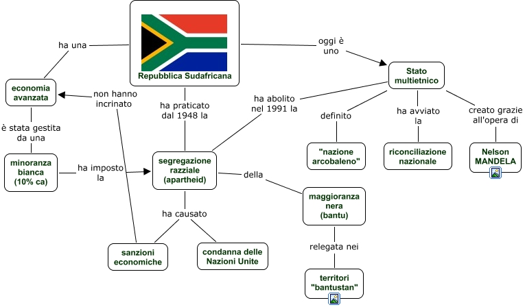 Questa Cmap, creata con IHMC CmapTools, contiene informazioni relative a: 371) Sudafrica, segregazione razziale (apartheid) ha causato sanzioni economiche, Stato multietnico creato grazie all'opera di Nelson MANDELA, Repubblica Sudafricana ha una economia avanzata, Repubblica Sudafricana oggi è uno Stato multietnico, Stato multietnico ha abolito nel 1991 la segregazione razziale (apartheid), segregazione razziale (apartheid) ha causato condanna delle Nazioni Unite, Stato multietnico definito "nazione arcobaleno", economia avanzata è stata gestita da una minoranza bianca (10% ca), segregazione razziale (apartheid) della maggioranza nera (bantu), minoranza bianca (10% ca) ha imposto la segregazione razziale (apartheid), sanzioni economiche non hanno incrinato economia avanzata, maggioranza nera (bantu) relegata nei territori "bantustan", Stato multietnico ha avviato la riconciliazione nazionale, Repubblica Sudafricana ha praticato dal 1948 la segregazione razziale (apartheid)