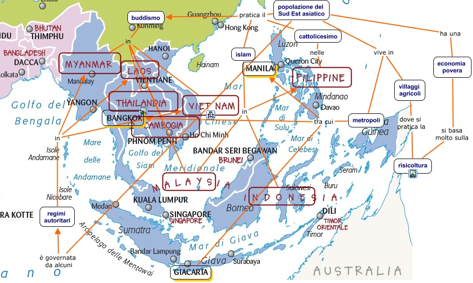 Questa Cmap, creata con IHMC CmapTools, contiene informazioni relative a: 390) Asia - Sud Est antropico, popolazione del Sud Est asiatico pratica il buddismo, villaggi agricoli dove si pratica la risicoltura, buddismo in Cambogia, metropoli tra cui Bangkok, islam in Filippine, regimi autoritari in Myanmar, islam in Malesia, popolazione del Sud Est asiatico è governata da alcuni regimi autoritari, buddismo in Laos, economia povera si basa molto sulla risicoltura, regimi autoritari in Laos, regimi autoritari in Vietnam, buddismo in Myanmar, buddismo in Malesia, popolazione del Sud Est asiatico ha una economia povera, metropoli tra cui Giacarta, metropoli tra cui Manila, buddismo in Thailandia, islam in Indonesia, buddismo in Vietnam