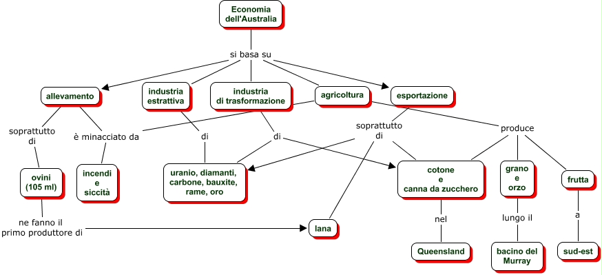 Questa Cmap, creata con IHMC CmapTools, contiene informazioni relative a: 380) Australia - economia, Economia dell'Australia si basa su allevamento, agricoltura produce frutta, Economia dell'Australia si basa su esportazione, industria di trasformazione di uranio, diamanti, carbone, bauxite, rame, oro, agricoltura produce grano e orzo, industria di trasformazione di cotone e canna da zucchero, allevamento soprattutto di ovini (105 ml), Economia dell'Australia si basa su agricoltura, ovini (105 ml) ne fanno il primo produttore di lana, agricoltura è minacciato da incendi e siccità, esportazione soprattutto di lana, frutta a sud-est, industria estrattiva di uranio, diamanti, carbone, bauxite, rame, oro, agricoltura produce cotone e canna da zucchero, allevamento è minacciato da incendi e siccità, Economia dell'Australia si basa su industria di trasformazione, esportazione soprattutto di cotone e canna da zucchero, grano e orzo lungo il bacino del Murray, esportazione soprattutto di uranio, diamanti, carbone, bauxite, rame, oro, Economia dell'Australia si basa su industria estrattiva