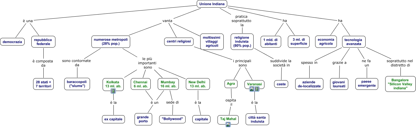 Questa Cmap, creata con IHMC CmapTools, contiene informazioni relative a: 390) Unione Indiana, religione induista (80% pop.) suddivide la società in caste, Agra ospita il Taj Mahal, Unione Indiana pratica soprattutto la religione induista (80% pop.), numerose metropoli (28% pop.) le più importanti sono New Delhi 13 ml. ab., tecnologia avanzata grazie a giovani laureati, numerose metropoli (28% pop.) sono contornate da baraccopoli ("slums"), Unione Indiana è una democrazia, Unione Indiana ha tecnologia avanzata, centri religiosi i principali sono Agra, Unione Indiana ha 3 ml. di superficie, Unione Indiana ha 1 mld. di abitanti, Mumbay 16 ml. ab. è un grande porto, Unione Indiana è una repubblica federale, Mumbay 16 ml. ab. sede di "Bollywood", tecnologia avanzata ne fa un paese emergente, Varanasi è la città santa induista, Unione Indiana vanta moltissimi villaggi agricoli, tecnologia avanzata soprattutto nel distretto di Bangalore "Silicon Valley indiana", New Delhi 13 ml. ab. è la capitale, centri religiosi i principali sono Varanasi