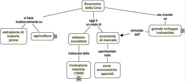 Questa Cmap, creata con IHMC CmapTools, contiene informazioni relative a: 390) Cina - economia, economia di mercato sperimentata nelle zone economiche speciali, "fabbrica del mondo" di alimentari, cereali riso OGM, "fabbrica del mondo" di elettronica, Economia della Cina sta vivendo un grande sviluppo industriale, fabbisogno di risorse energetiche parzialmente coperto da centrali idroelettriche, grande sviluppo industriale stimolato dall' economia di mercato, fabbisogno di risorse energetiche parzialmente coperto da carbone, Economia della Cina si basa tradizionalmente su estrazione di materie prime, "fabbrica del mondo" di tessili, grande sviluppo industriale genera enormi danni ambientali, sistema socialista instaurato dalla rivoluzione maoista (1949), Economia della Cina oggi è un misto di sistema socialista, privatizzazione delle terre ha creato disoccupazione, grande sviluppo industriale crea un grande fabbisogno di risorse energetiche, Economia della Cina si basa tradizionalmente su agricoltura, centrali idroelettriche diga delle Tre Gole, grande sviluppo industriale cresce a ritmi vertiginosi, Economia della Cina oggi è un misto di economia di mercato, agricoltura (49% pop. att.) copre il fabbisogno interno