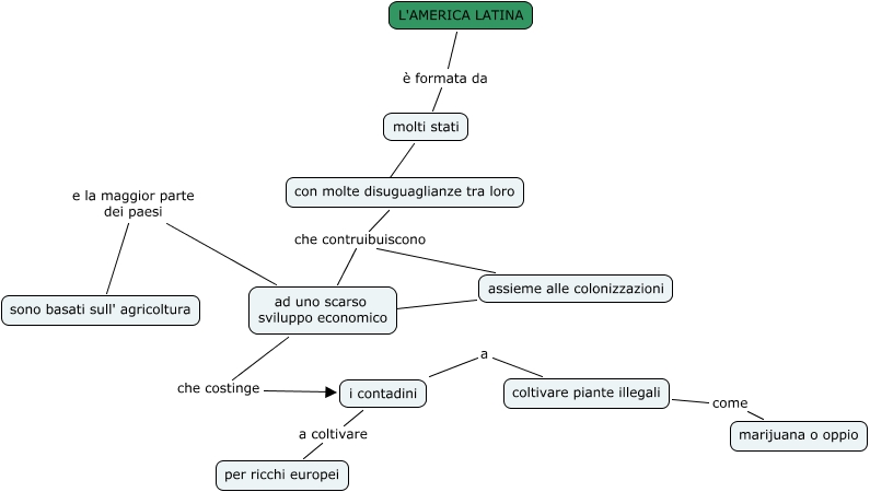Questa Cmap, creata con IHMC CmapTools, contiene informazioni relative a: lo sviluppo umano, con molte disuguaglianze tra loro che contruibuiscono ad uno scarso sviluppo economico, ad uno scarso sviluppo economico che costinge i contadini, molti stati ???? con molte disuguaglianze tra loro, i contadini a coltivare piante illegali, ad uno scarso sviluppo economico e la maggior parte dei paesi sono basati sull' agricoltura, assieme alle colonizzazioni che contruibuiscono ad uno scarso sviluppo economico, L'AMERICA LATINA è formata da molti stati, coltivare piante illegali come marijuana o oppio, i contadini a coltivare per ricchi europei, assieme alle colonizzazioni ???? ad uno scarso sviluppo economico