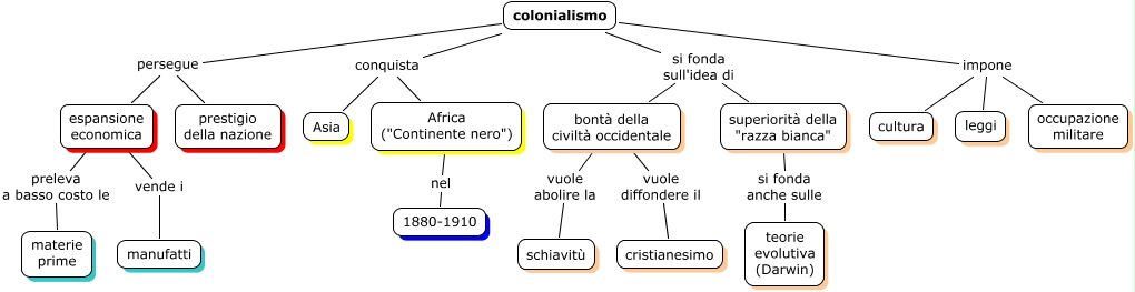 Questa Cmap, creata con IHMC CmapTools, contiene informazioni relative a: 370) Colonialismo, colonialismo impone leggi, colonialismo conquista Africa ("Continente nero"), espansione economica preleva a basso costo le materie prime, espansione economica vende i manufatti, colonialismo impone cultura, colonialismo persegue prestigio della nazione, bontà della civiltà occidentale vuole diffondere il cristianesimo, superiorità della "razza bianca" si fonda anche sulle teorie evolutiva (Darwin), colonialismo impone occupazione militare, colonialismo si fonda sull'idea di bontà della civiltà occidentale, colonialismo si fonda sull'idea di superiorità della "razza bianca", colonialismo persegue espansione economica, Africa ("Continente nero") nel 1880-1910, colonialismo conquista Asia, bontà della civiltà occidentale vuole abolire la schiavitù