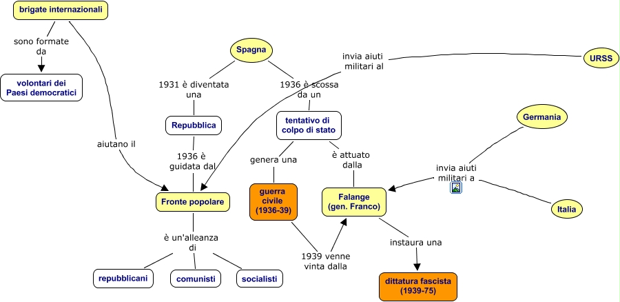 Questa Cmap, creata con IHMC CmapTools, contiene informazioni relative a: 390) Guerra civile spagnola, Fronte popolare è un'alleanza di socialisti, Repubblica 1936 è guidata dal Fronte popolare, guerra civile (1936-39) 1939 venne vinta dalla Falange (gen. Franco), tentativo di colpo di stato genera una guerra civile (1936-39), Falange (gen. Franco) instaura una dittatura fascista (1939-75), Spagna 1931 è diventata una Repubblica, tentativo di colpo di stato è attuato dalla Falange (gen. Franco), brigate internazionali sono formate da volontari dei Paesi democratici, Spagna 1936 è scossa da un tentativo di colpo di stato, Germania invia aiuti militari a Falange (gen. Franco), brigate internazionali aiutano il Fronte popolare, Fronte popolare è un'alleanza di comunisti, URSS invia aiuti militari al Fronte popolare, Fronte popolare è un'alleanza di repubblicani, Italia invia aiuti militari a Falange (gen. Franco)