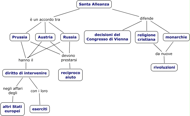 Questa Cmap, creata con IHMC CmapTools, contiene informazioni relative a: 02) Santa Alleanza, diritto di intervenire con i loro eserciti, Santa Alleanza difende monarchie, Santa Alleanza difende religione cristiana, Santa Alleanza è un accordo tra Russia, Prussia hanno il diritto di intervenire, Santa Alleanza difende decisioni del Congresso di Vienna, Prussia devono prestarsi reciproco aiuto, Austria devono prestarsi reciproco aiuto, Austria hanno il diritto di intervenire, Santa Alleanza è un accordo tra Prussia, Santa Alleanza è un accordo tra Austria, Russia devono prestarsi reciproco aiuto, diritto di intervenire negli affari degli altri Stati europei, Russia hanno il diritto di intervenire, monarchie da nuove rivoluzioni, religione cristiana da nuove rivoluzioni