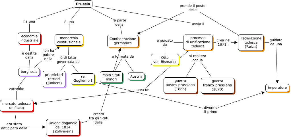 Questa Cmap, creata con IHMC CmapTools, contiene informazioni relative a: 363) Germania - unificazione, Unione doganale del 1834 (Zollverein) creata tra gli Stati della Confederazione germanica, monarchia costituzionale è di fatto governata da re Gugliemo I, Confederazione germanica è formata da molti Stati minori, Confederazione germanica è formata da Austria, re Gugliemo I divenne il primo imperatore, mercato tedesco unificato era stato anticipato dalla Unione doganale del 1834 (Zollverein), borghesia vorrebbe mercato tedesco unificato, processo di unificazione tedesca è guidato da Otto von Bismarck, processo di unificazione tedesca si realizza con la guerra austro-prussiana (1866), Federazione tedesca (Reich) guidata da una imperatore, processo di unificazione tedesca si realizza con la guerra franco-prussiana (1870), Prussia fa parte della Confederazione germanica, Federazione tedesca (Reich) prende il posto della Confederazione germanica, Prussia ha una economia industriale, processo di unificazione tedesca crea un mercato tedesco unificato, Prussia avvia il processo di unificazione tedesca, Prussia è una monarchia costituzionale, economia industriale è gestita dalla borghesia, monarchia costituzionale è di fatto governata da proprietari terrieri (junkers), processo di unificazione tedesca crea nel 1871 il Federazione tedesca (Reich)