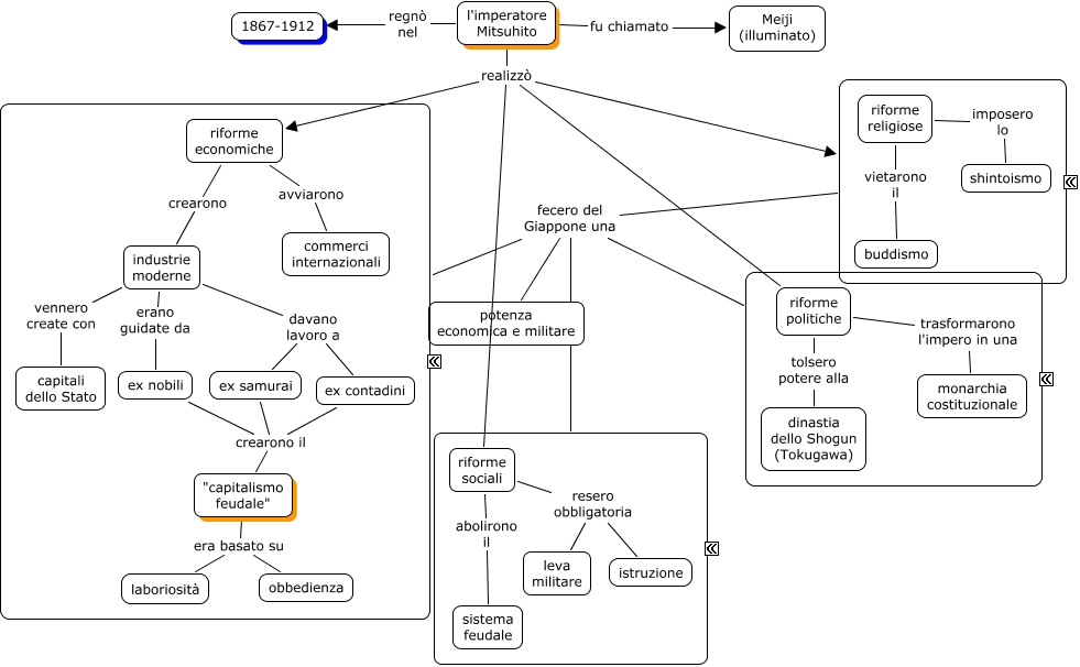 Questa Cmap, creata con IHMC CmapTools, contiene informazioni relative a: 366) Giappone - Epoca Meiji, riforme economiche avviarono commerci internazionali, riforme sociali abolirono il sistema feudale, l'imperatore Mitsuhito realizzò riforme politiche, l'imperatore Mitsuhito realizzò riforme sociali, l'imperatore Mitsuhito realizzò riforme economiche, riforme sociali resero obbligatoria istruzione, riforme religiose vietarono il buddismo, industrie moderne vennero create con capitali dello Stato, l'imperatore Mitsuhito regnò nel 1867-1912, riforme religiose imposero lo shintoismo, riforme economiche fecero del Giappone una potenza economica e militare, ex nobili crearono il "capitalismo feudale", riforme economiche crearono industrie moderne, riforme politiche trasformarono l'impero in una monarchia costituzionale, "capitalismo feudale" era basato su laboriosità, industrie moderne davano lavoro a ex samurai, "capitalismo feudale" era basato su obbedienza, l'imperatore Mitsuhito realizzò riforme religiose, industrie moderne davano lavoro a ex contadini, riforme sociali fecero del Giappone una potenza economica e militare