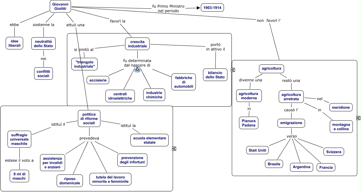 Questa Cmap, creata con IHMC CmapTools, contiene informazioni relative a: 358) Età giolittiana, Giovanni Giolitti ebbe idee liberali, politica di riforme sociali prevedeva assistenza per invalidi e anziani, Giovanni Giolitti fu Primo Ministro nel periodo 1903-1914, crescita industriale portò in attivo il bilancio dello Stato, suffragio universale maschile estese il voto a 8 ml di maschi, emigrazione verso Francia, agricoltura moderna in Pianura Padana, politica di riforme sociali istituì il suffragio universale maschile, politica di riforme sociali prevedeva prevenzione degli infortuni, agricoltura divenne una agricoltura moderna, Giovanni Giolitti non favorì l' agricoltura, crescita industriale fu determinata dal nascere di industrie chimiche, crescita industriale fu determinata dal nascere di acciaierie, politica di riforme sociali prevedeva riposo domenicale, emigrazione verso Argentina, agricoltura arretrata nel meridione, emigrazione verso Svizzera, agricoltura arretrata causò l' emigrazione, crescita industriale fu determinata dal nascere di centrali idroelettriche, emigrazione verso Stati Uniti