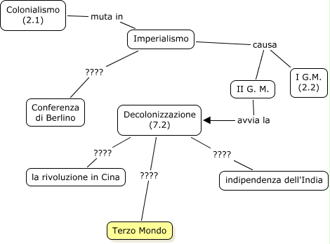 Questa Cmap, creata con IHMC CmapTools, contiene informazioni relative a: 40) Terzo Mondo, Imperialismo causa I G.M. (2.2), Colonialismo (2.1) muta in Imperialismo, Imperialismo ???? Conferenza di Berlino, Decolonizzazione (7.2) ???? Terzo Mondo, II G. M. avvia la Decolonizzazione (7.2), Decolonizzazione (7.2) ???? la rivoluzione in Cina, Decolonizzazione (7.2) ???? indipendenza dell'India, Imperialismo causa II G. M.