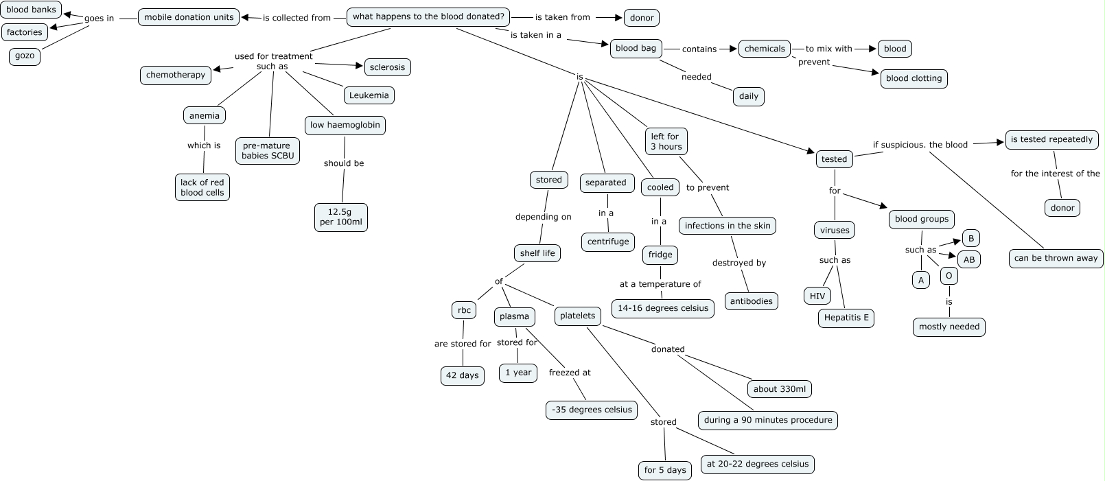 This Concept Map, created with IHMC CmapTools, has information related to: DANIELA POST, tested for blood groups, cooled in a fridge, what happens to the blood donated? is taken in a blood bag, blood groups such as A, what happens to the blood donated? is left for 3 hours, tested if suspicious. the blood is tested repeatedly, infections in the skin destroyed by antibodies, what happens to the blood donated? used for treatment such as sclerosis, blood groups such as O, what happens to the blood donated? is taken from donor, blood groups such as B, tested for viruses, mobile donation units goes in gozo, separated in a centrifuge, chemicals prevent blood clotting, plasma freezed at -35 degrees celsius, chemicals to mix with blood, platelets donated during a 90 minutes procedure, shelf life of rbc, viruses such as Hepatitis E